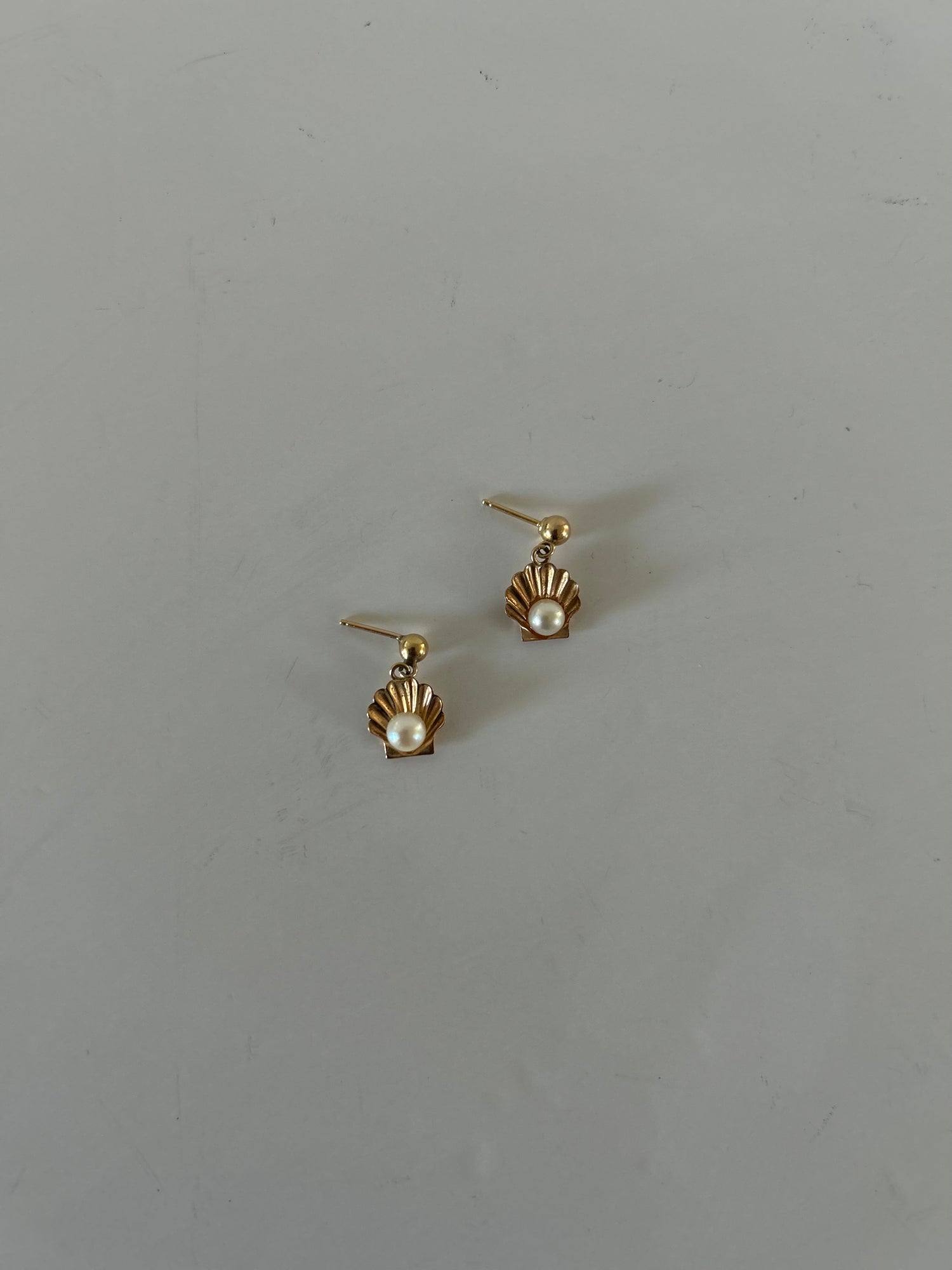 Vintage dainty pair of 14k yellow gold seashell earrings, each featuring a pearl nestled within the shell design. Stud size style with post back closure.