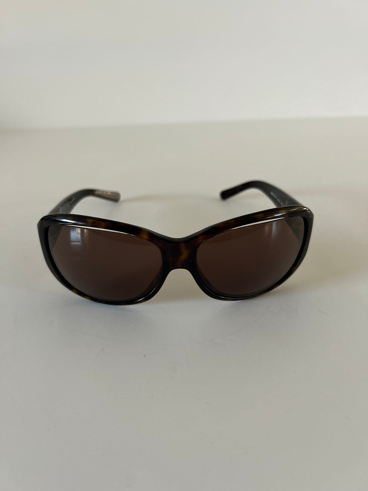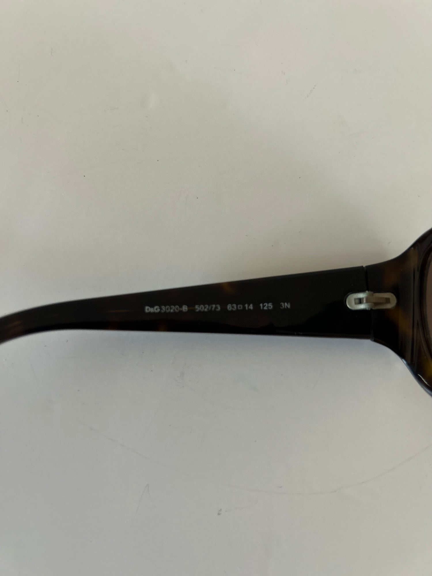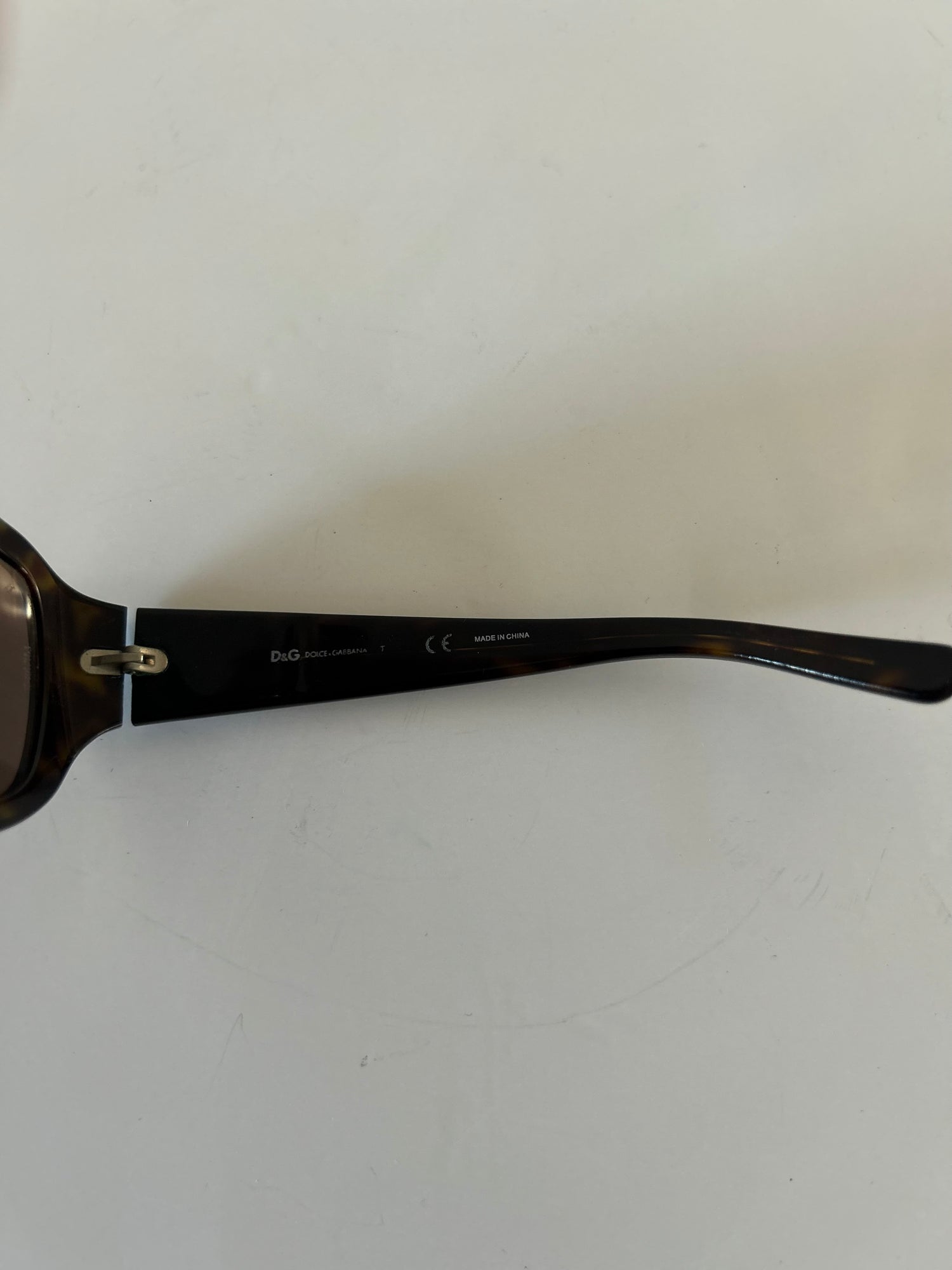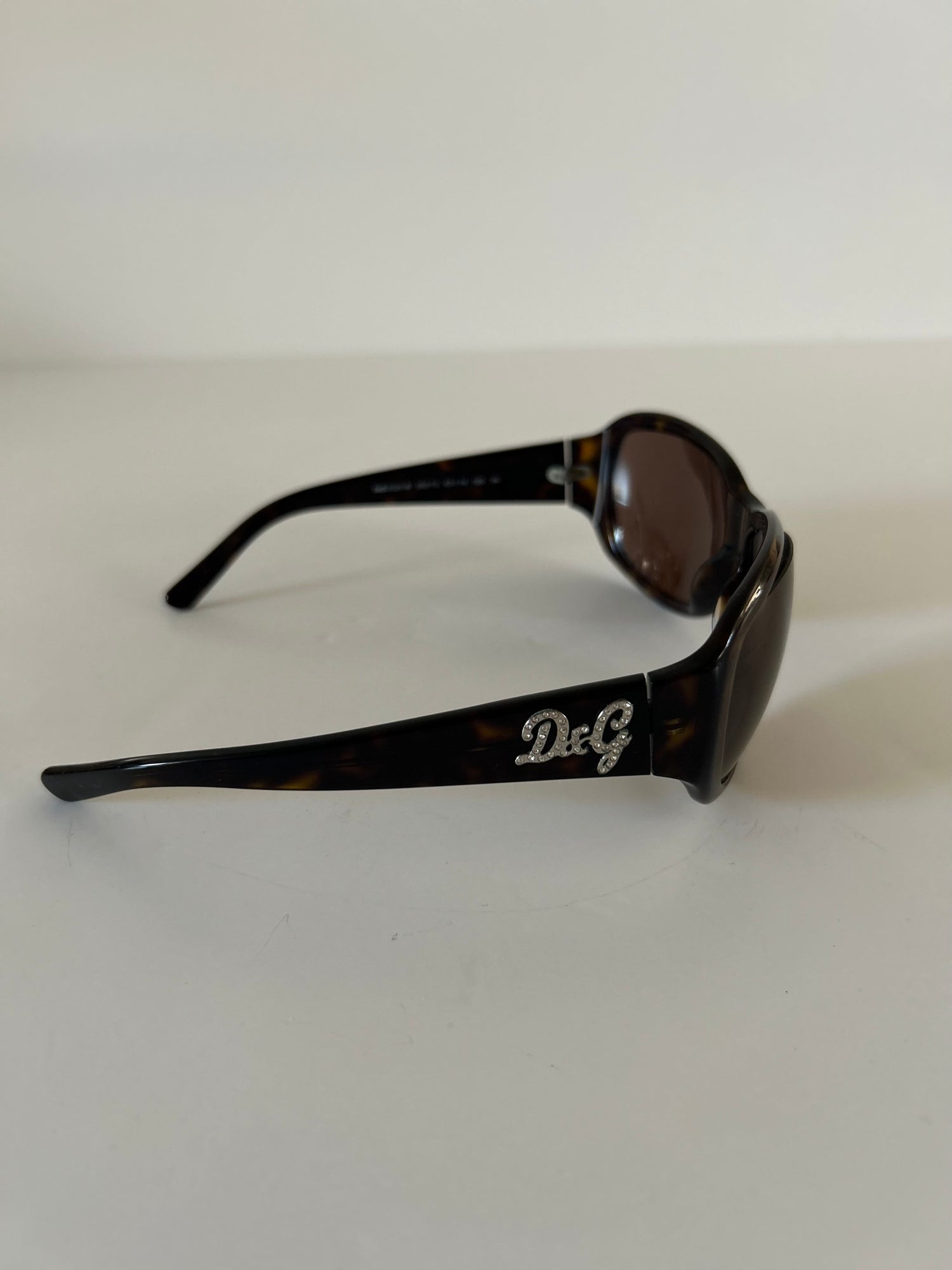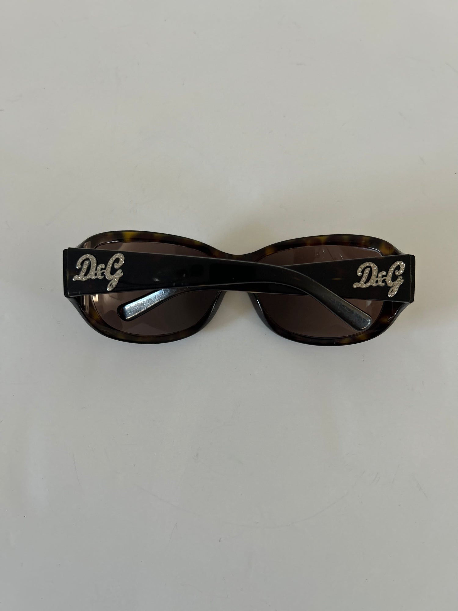 A pair of stylish D&G sunglasses featuring a classic tortoiseshell frame and dark lenses. The temples are adorned with the "D&G" logo, embellished with sparkling rhinestones.