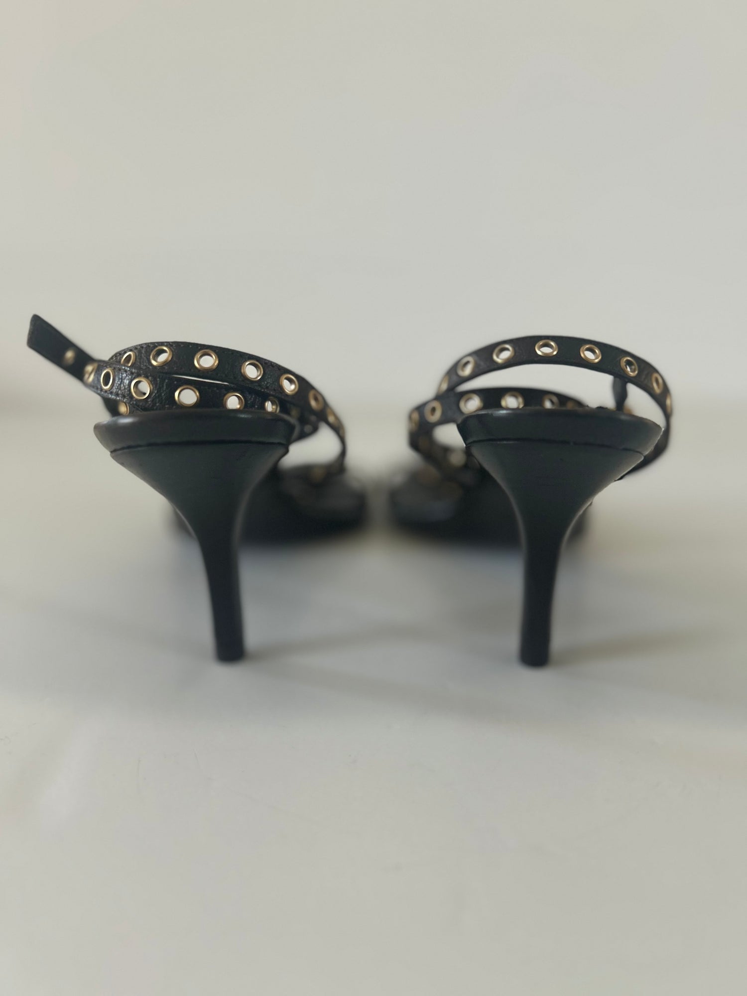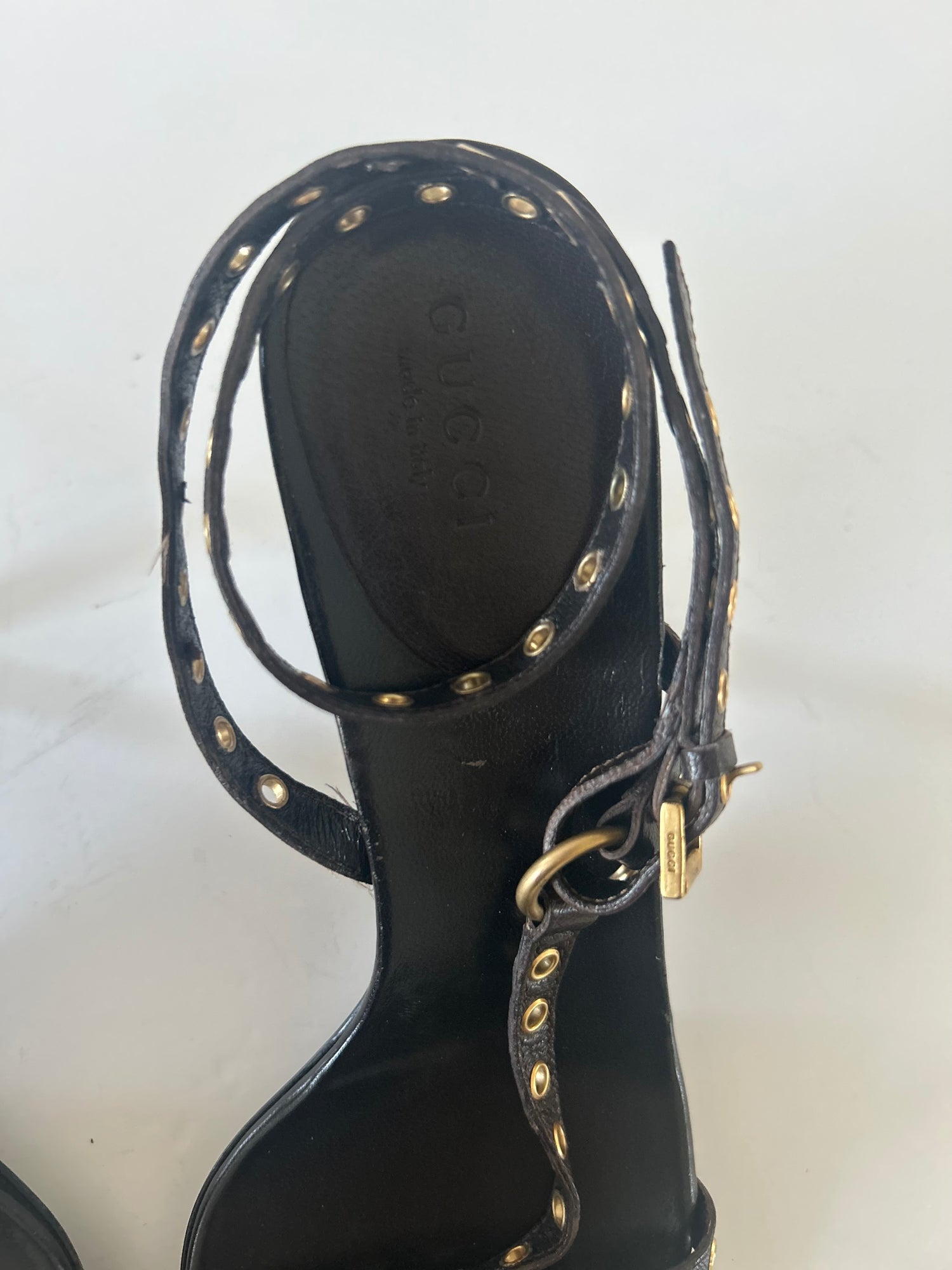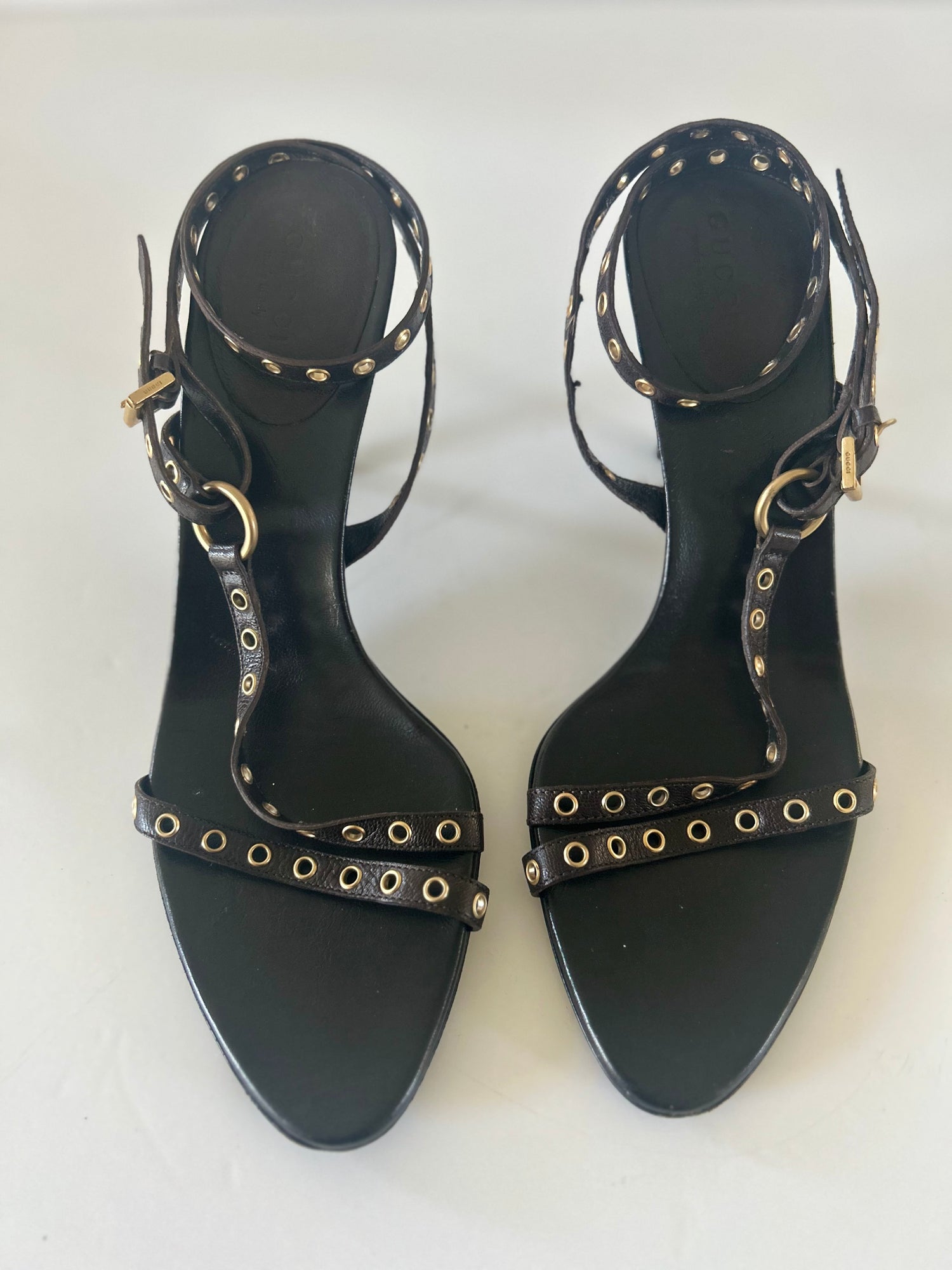 Unique vintage Gucci leather heel sandals. Color black with gold accents. An ankle wrap around style featuring gold gromet trims at ankle and on heel straps. Low heel height.