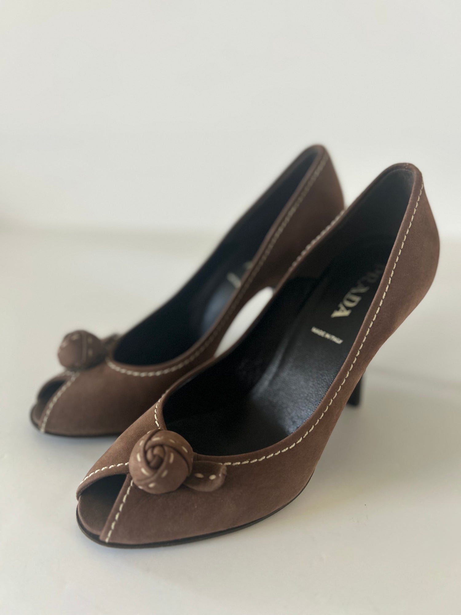 Designer Vintage Prada Milano Suede Rosette Peep Toe Heels