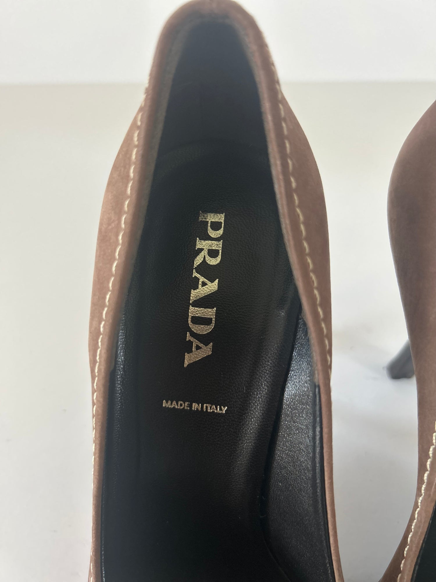 These vintage Prada peep toe heels are made of brown suede. Featuring a contrast over stitch and suede rosette. In excellent condition and come with its original box. Made in Italy.