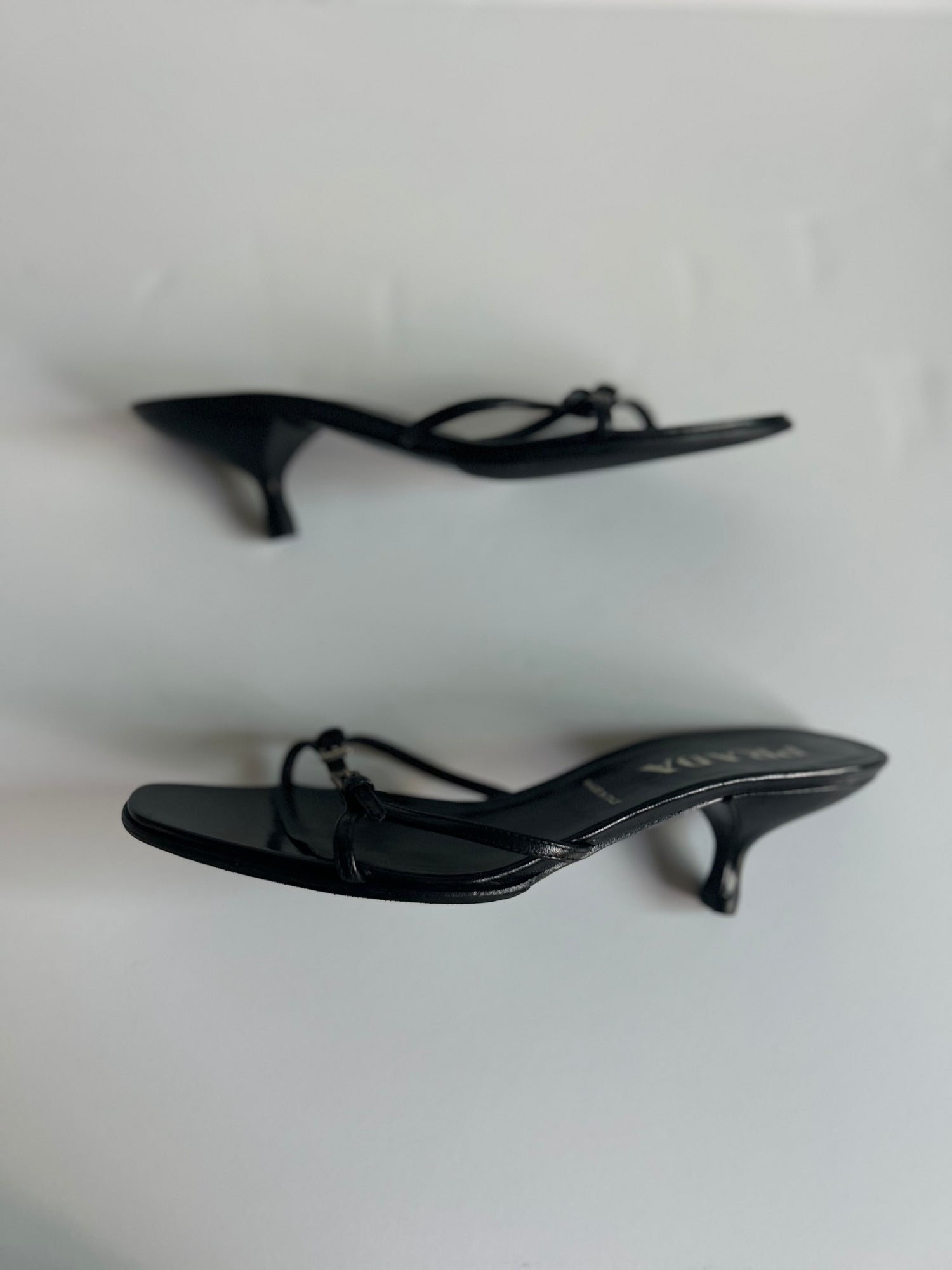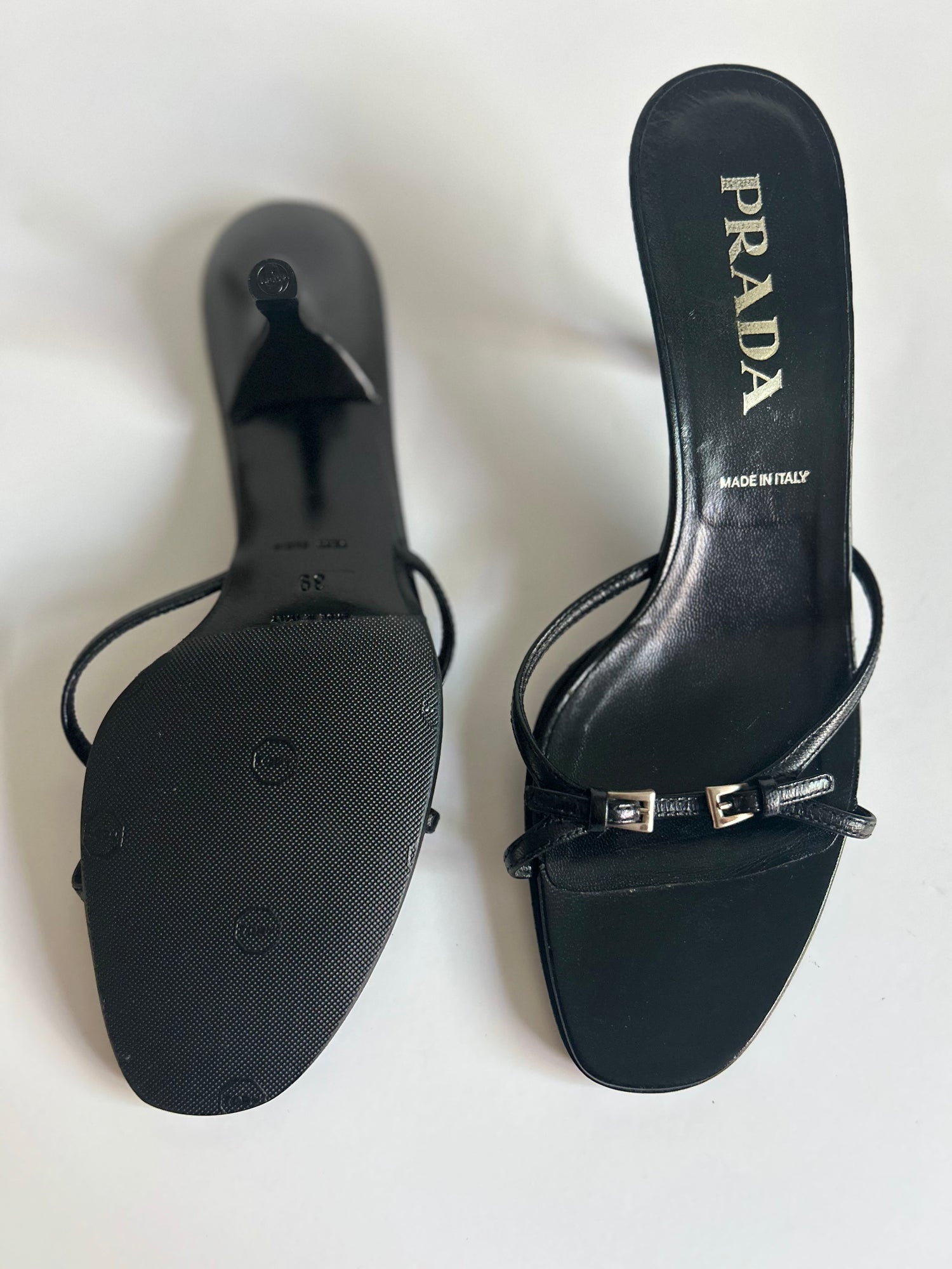 Vintage Prada slide heel strap sandals. Featuring a double cross strap and buckle detail at front. Has silver accents. Made in Italy. These heels are in perfect condition with zero marks of use.
