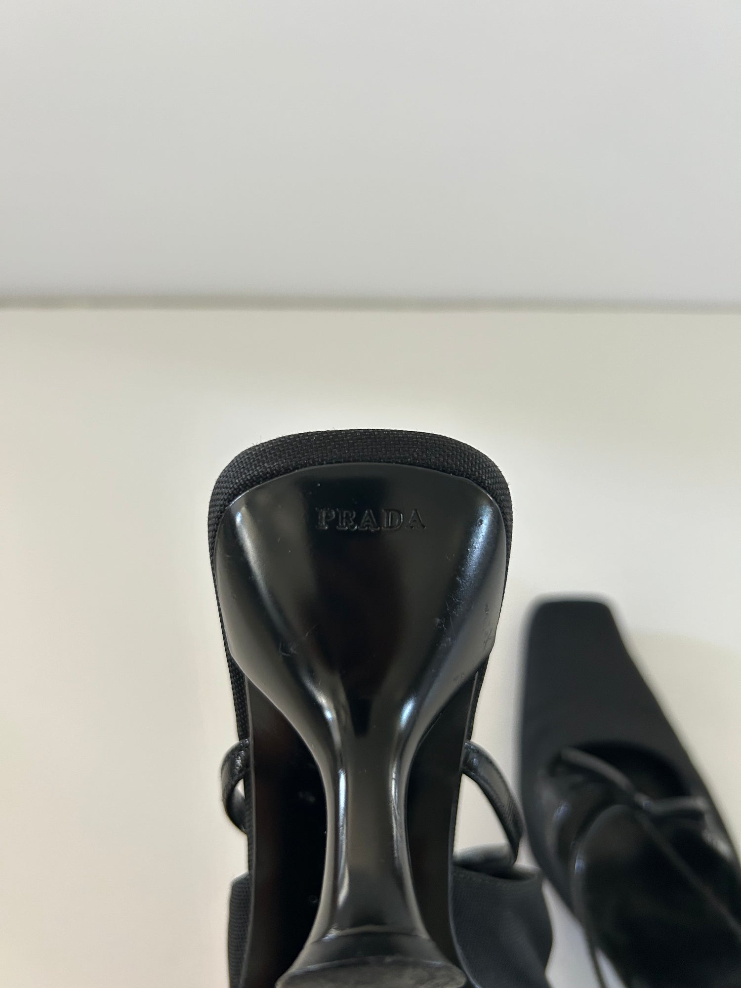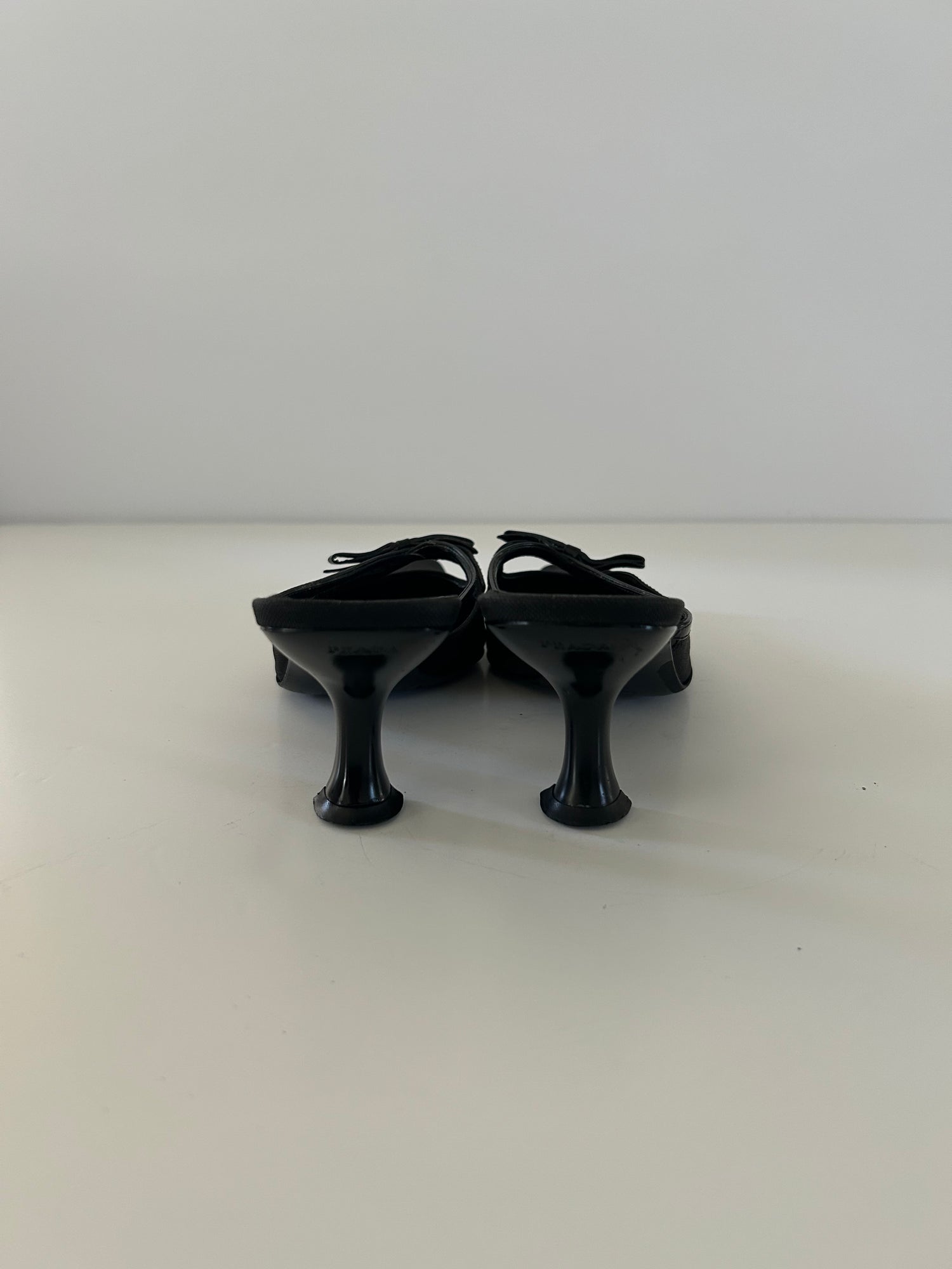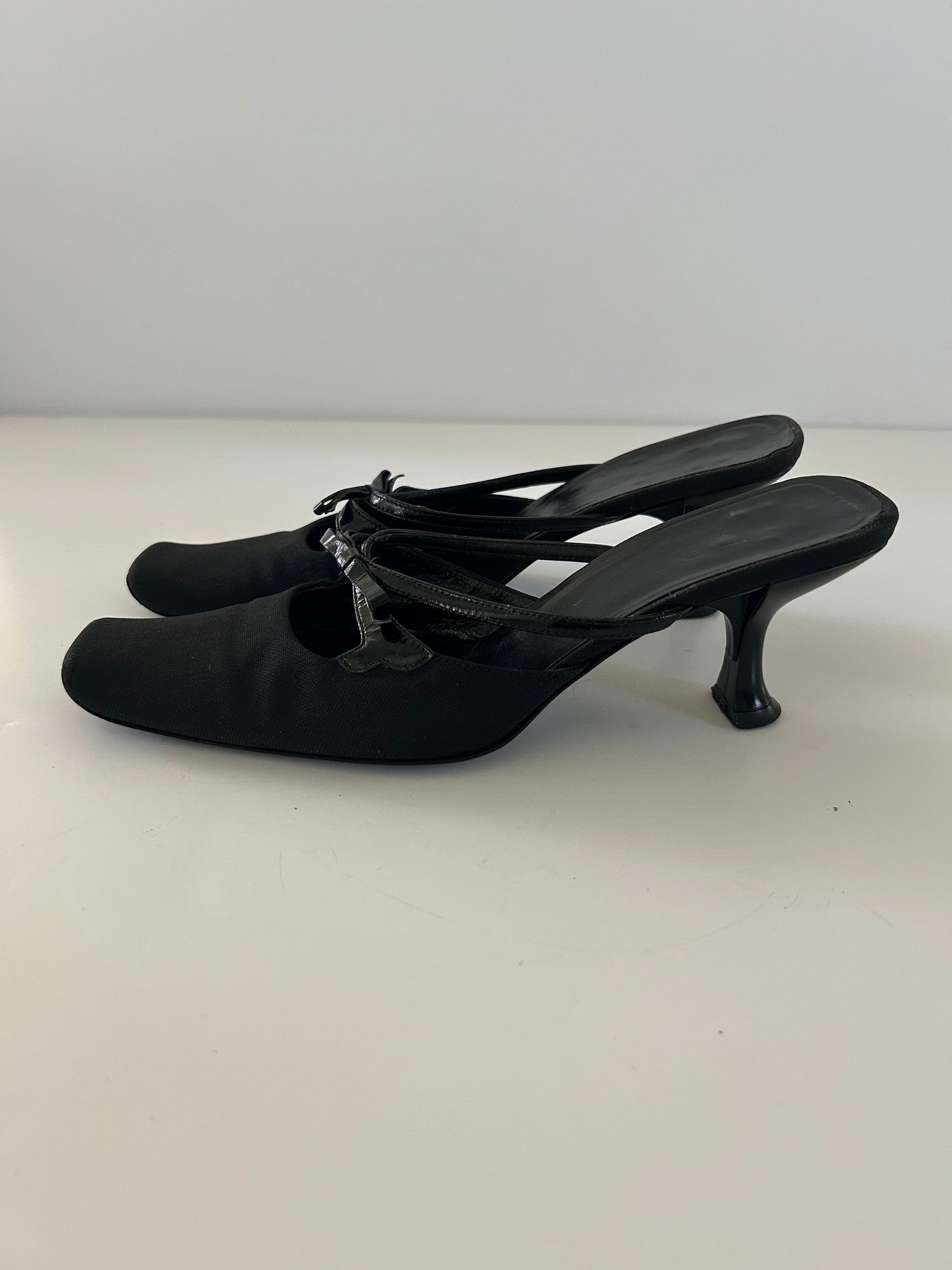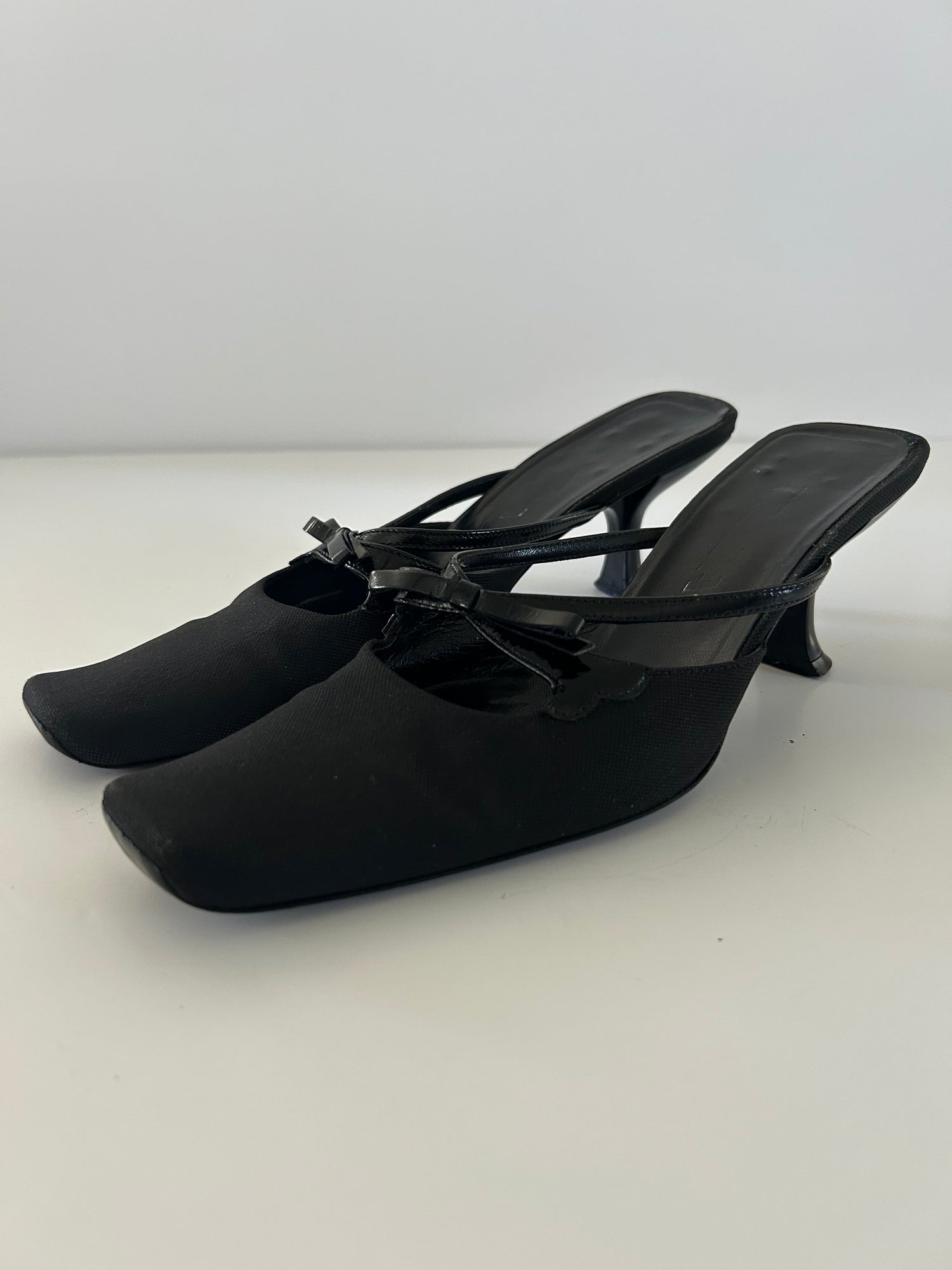 Designer vintage Prada square toe heels. These authentic Prada shoes feature a chic square toe with bow accent. The kitten heel slip on design makes them versatile and comfortable for both day and night. Material is leather and canvas. From the late 1990s era.