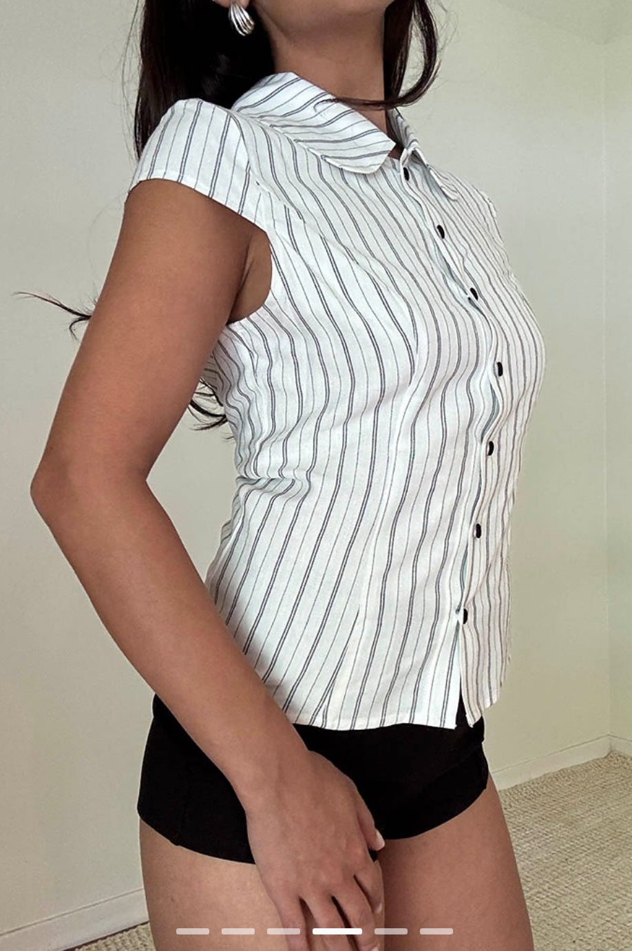 Elevate your everyday style with this charming striped button-down blouse, perfect for a touch of vintage-inspired elegance or a chic casual look. Features vertical black and white stripes offer a timeless and flattering aesthetic. Peter pan collar, a distinctive rounded collar adds a sweet and sophisticated touch. Functional black buttons, and short cap sleeves. Easily pairs with shorts, skirts, or trousers for various occasions, from casual outings to smart-casual events. Comes in a natural blend of silk and linen.